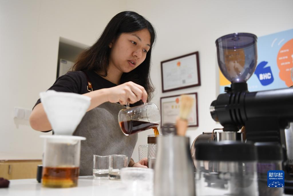 7月5日,在廣州市白云區的手心咖啡店,視障咖啡師陳柳曉在制作手沖咖啡。
