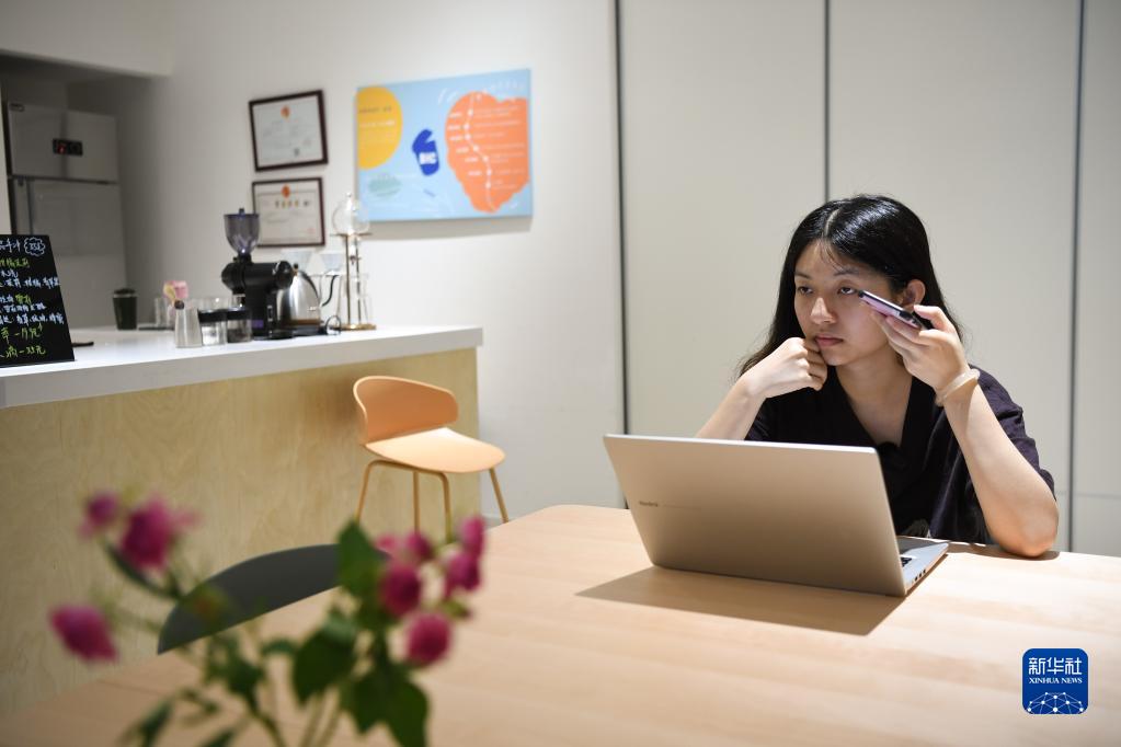 7月5日,在廣州市白云區的手心咖啡店,視障咖啡師陳柳曉在通過手機語音聽取留言。