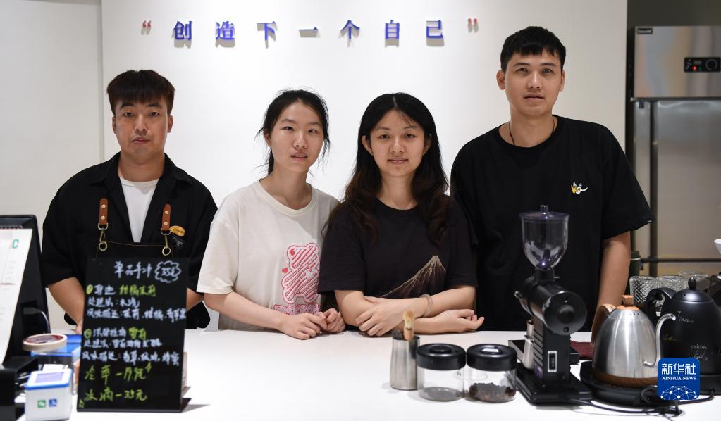 7月5日,在廣州市白云區的手心咖啡店,視障咖啡師陳柳曉(左三)和同事謝學通(右一)、巫佳純(左二)、楊培東合影。