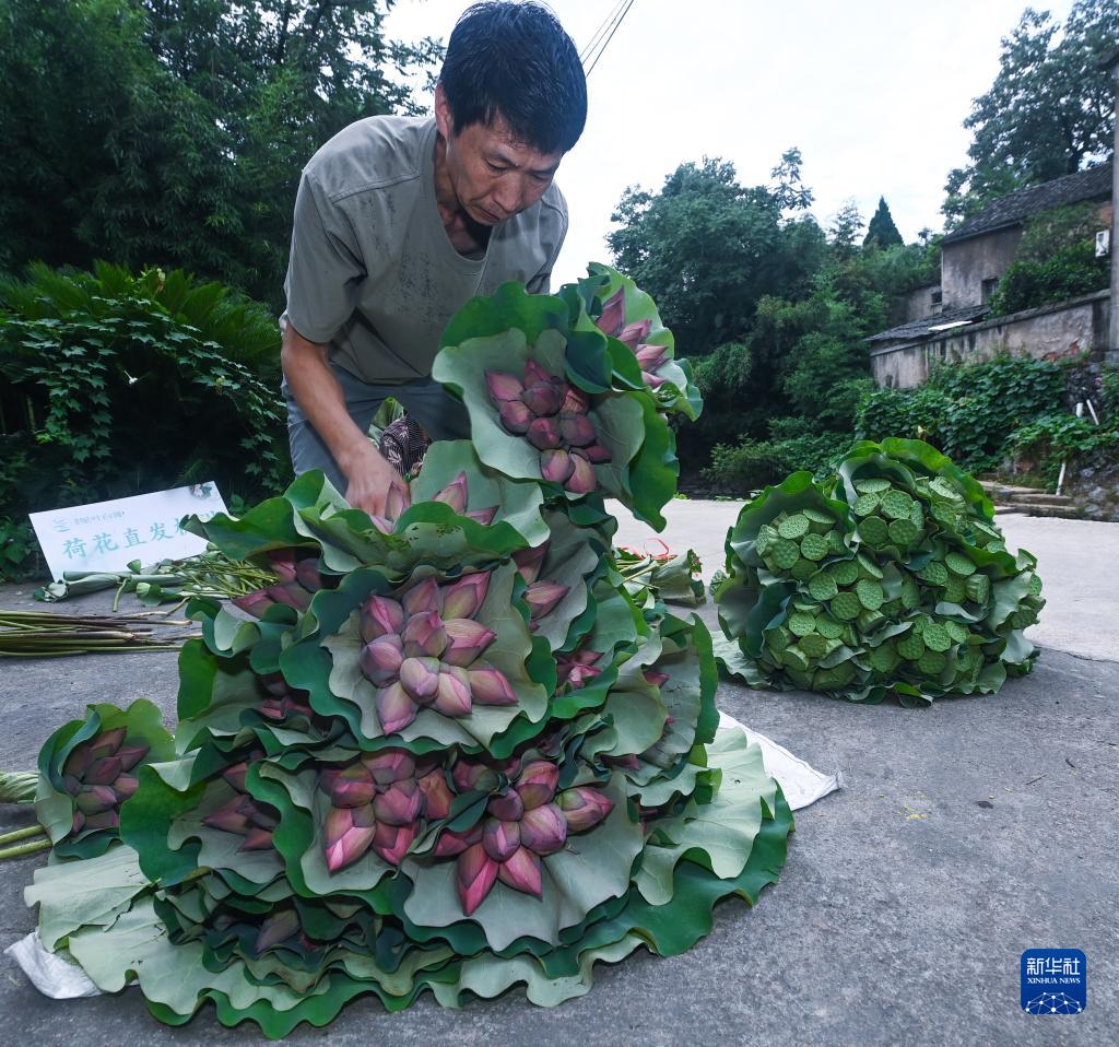 7月6日清晨,浙江省建德市大慈巖鎮里葉村村民在分類打包剛采摘的荷花和蓮蓬。這些荷花和蓮蓬分類包裝后,將快速運往江浙滬的花卉市場。