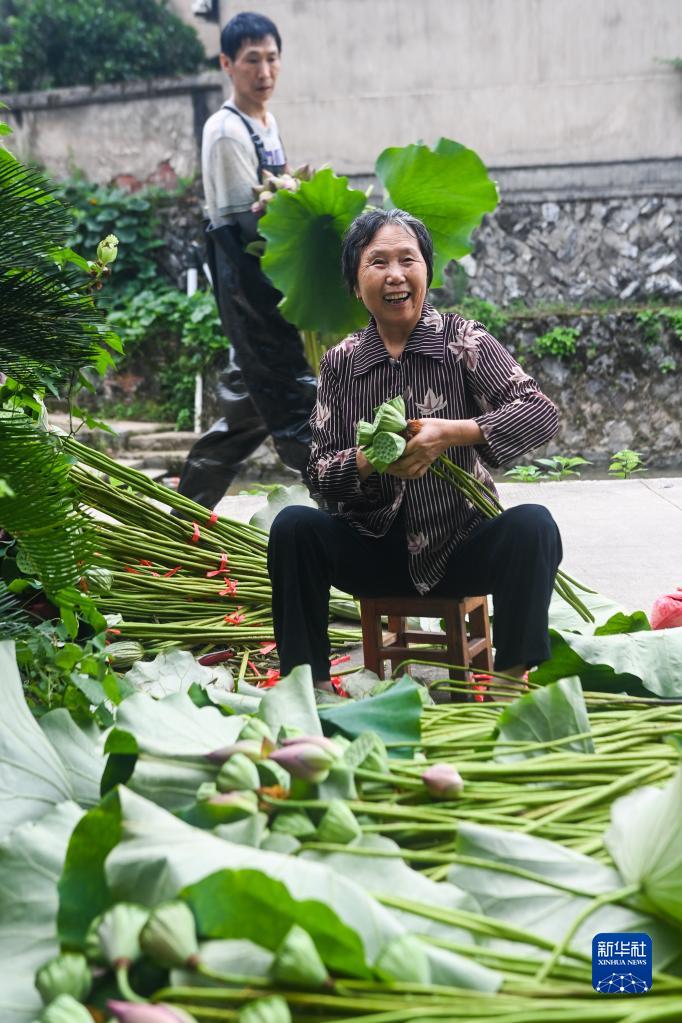 7月6日清晨,浙江省建德市大慈巖鎮里葉村村民在分類打包剛采摘的荷花和蓮蓬。這些荷花和蓮蓬分類包裝后,將快速運往江浙滬的花卉市場。