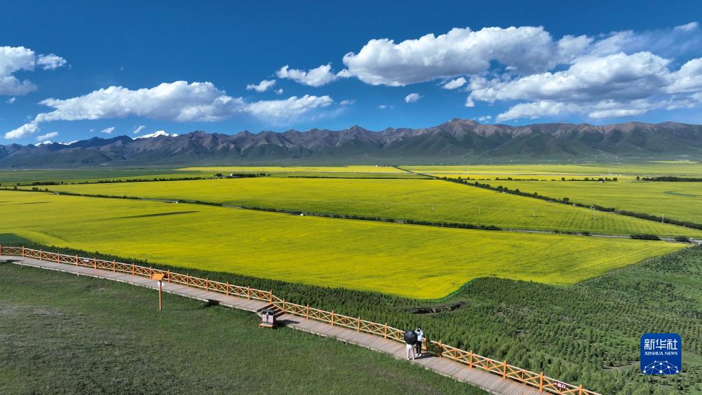 夏日,在位于祁連山腹地的青海省海北藏族自治州門源回族自治縣境內,油菜花競相綻放,花海、雪山、草原共同組成色彩斑斕的祁連山夏日畫卷。
