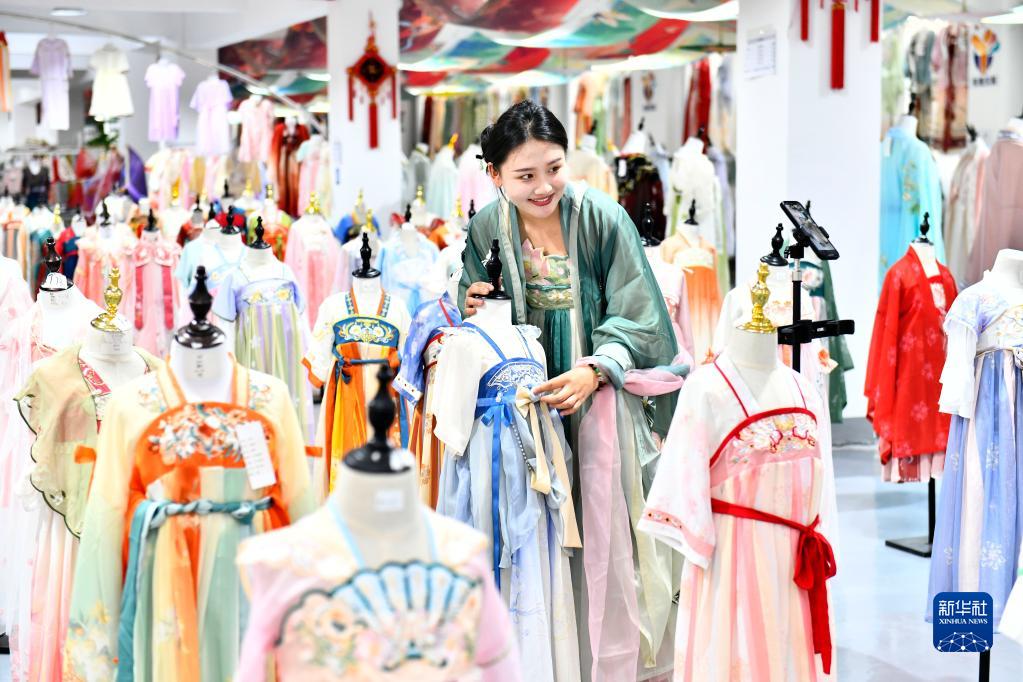 山東省曹縣依托電商資源優勢,聚力發展漢服產業,形成了從印染、剪裁、繡花、打版、成衣全產業鏈條。目前,曹縣共有漢服上下游企業2100多家,并在上海、西安、洛陽等地設有漢服基地,展銷推介曹縣漢服。今年1-6月,曹縣漢服營銷收入近40億元,漢服產業不僅成為當地群眾增收、鄉村振興的新引擎,還吸引了近兩萬名大學生返鄉就業、創業。