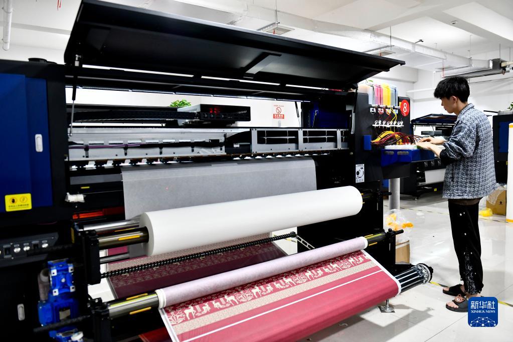7月6日,在曹縣大集鎮花王數碼印花廠,工作人員操作設備打印布樣。