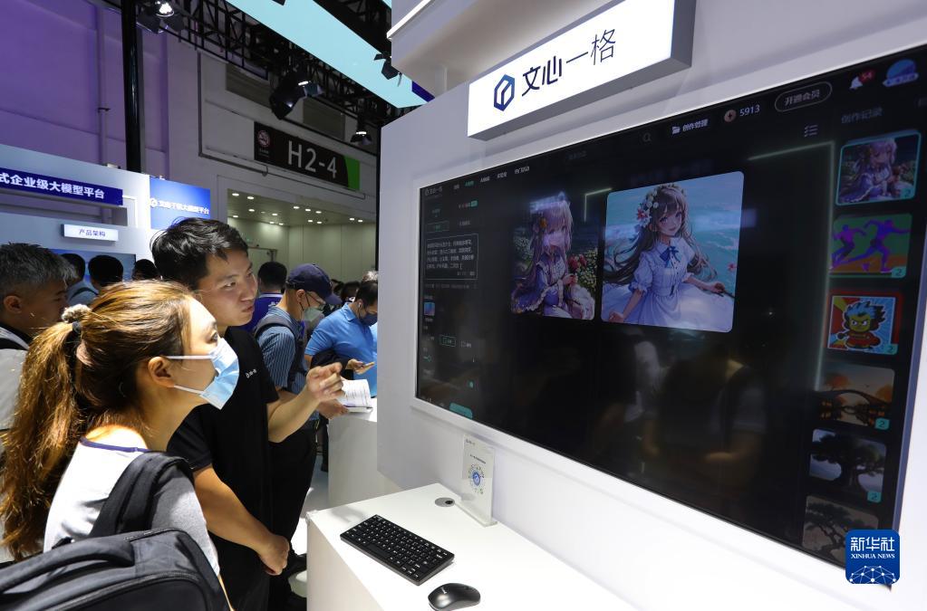 7月6日,工作人員在2023世界人工智能大會展會現場向參觀者介紹百度“文心一格”。