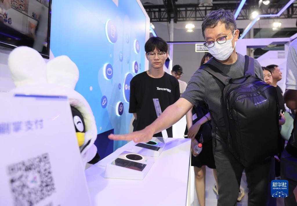 7月6日,參觀者在騰訊展位體驗刷掌支付。