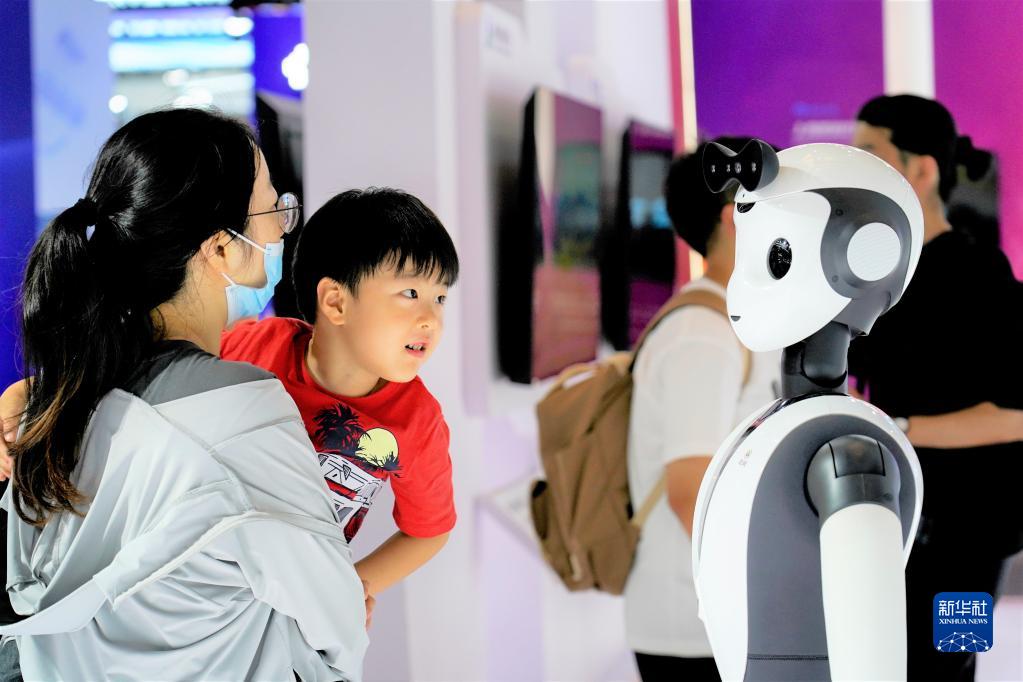 7月6日,參觀者在達闥展位與柔美人形智能服務機器人互動。
