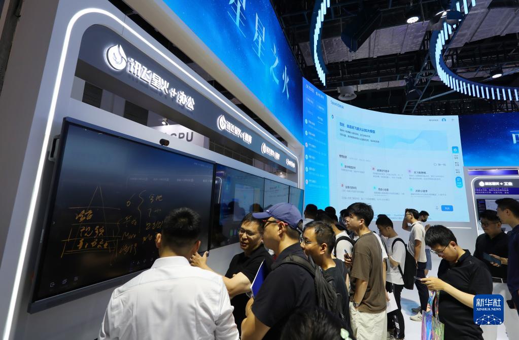 7月6日,參觀者在2023世界人工智能大會展會現場的訊飛星火認知大模型展示屏前交流。