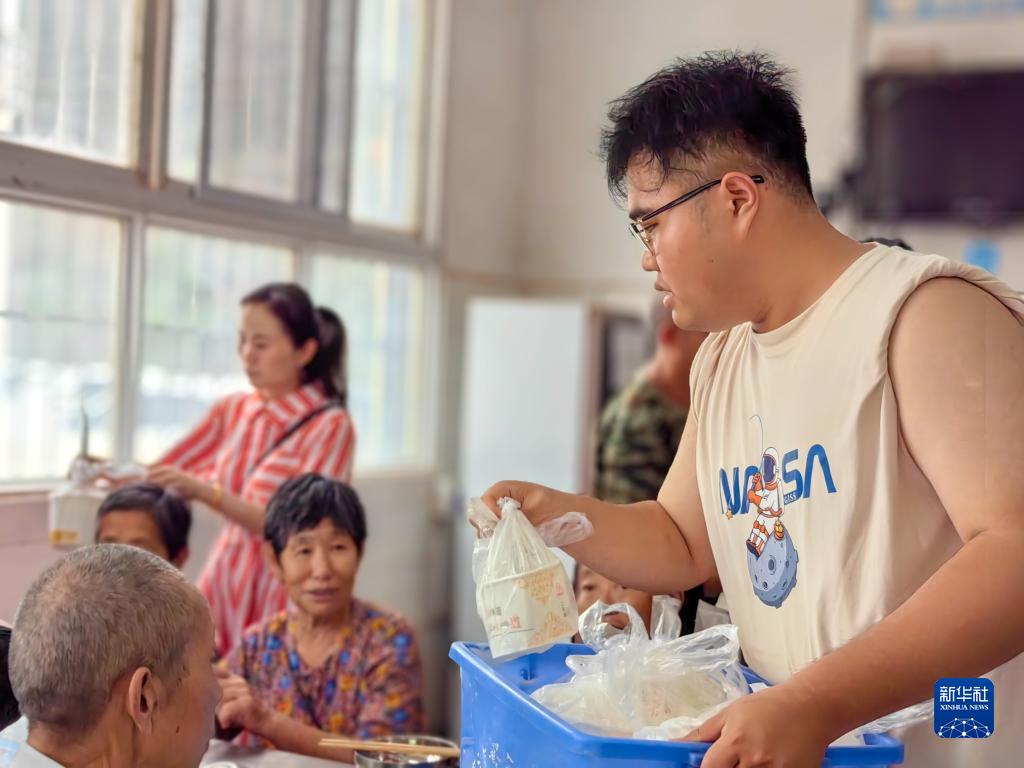 7月6日,志愿者在位于重慶市萬州區長灘初級中學的臨時安置點發放餐食。