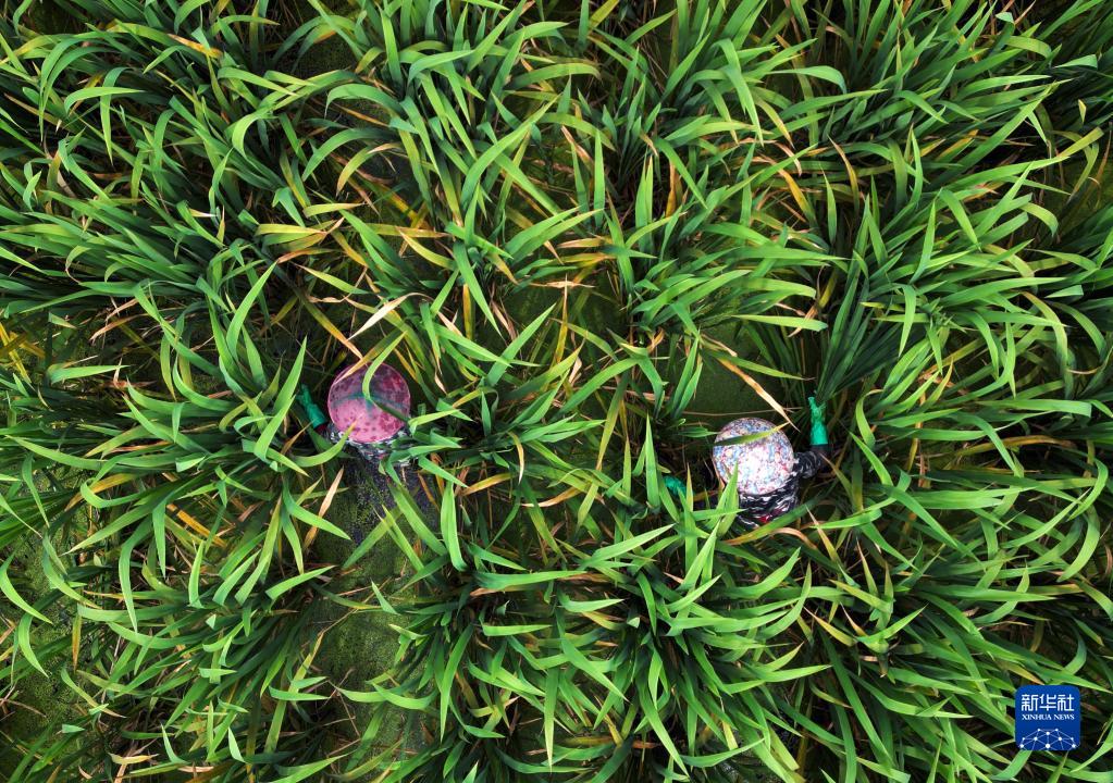 7月6日,蘆潼村的村民在采收茭白(無人機照片)。