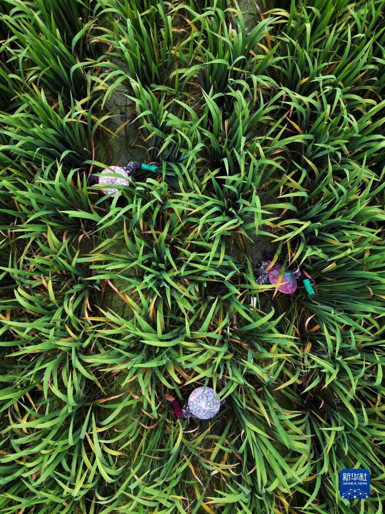 7月6日,蘆潼村的村民在采收茭白(無人機照片)。