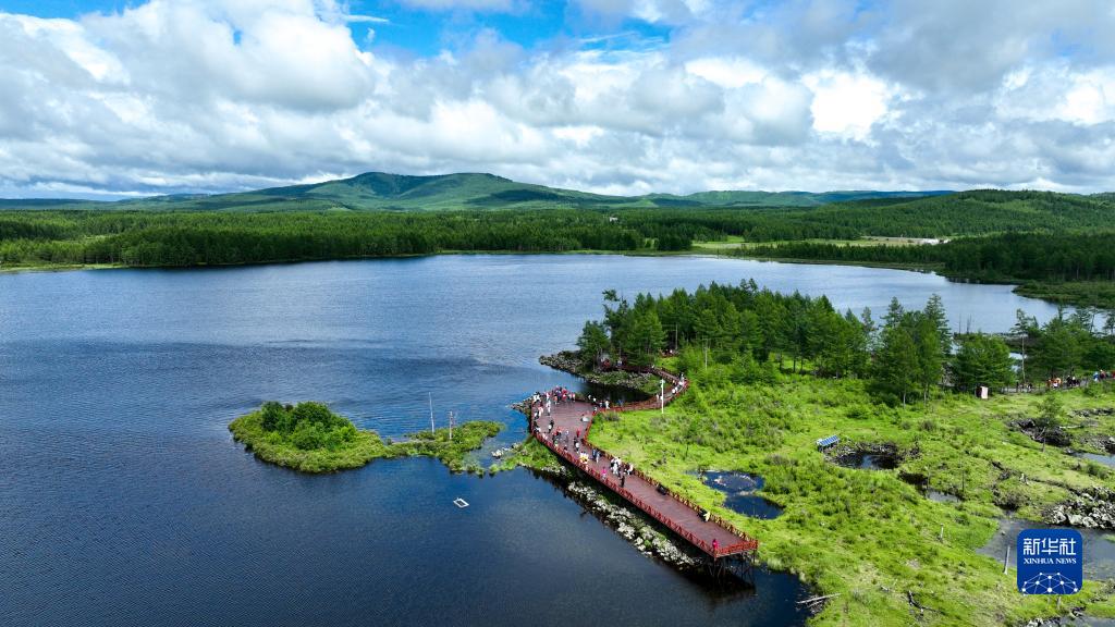7月6日,游客在阿爾山國家森林公園杜鵑湖游玩(無人機照片)。