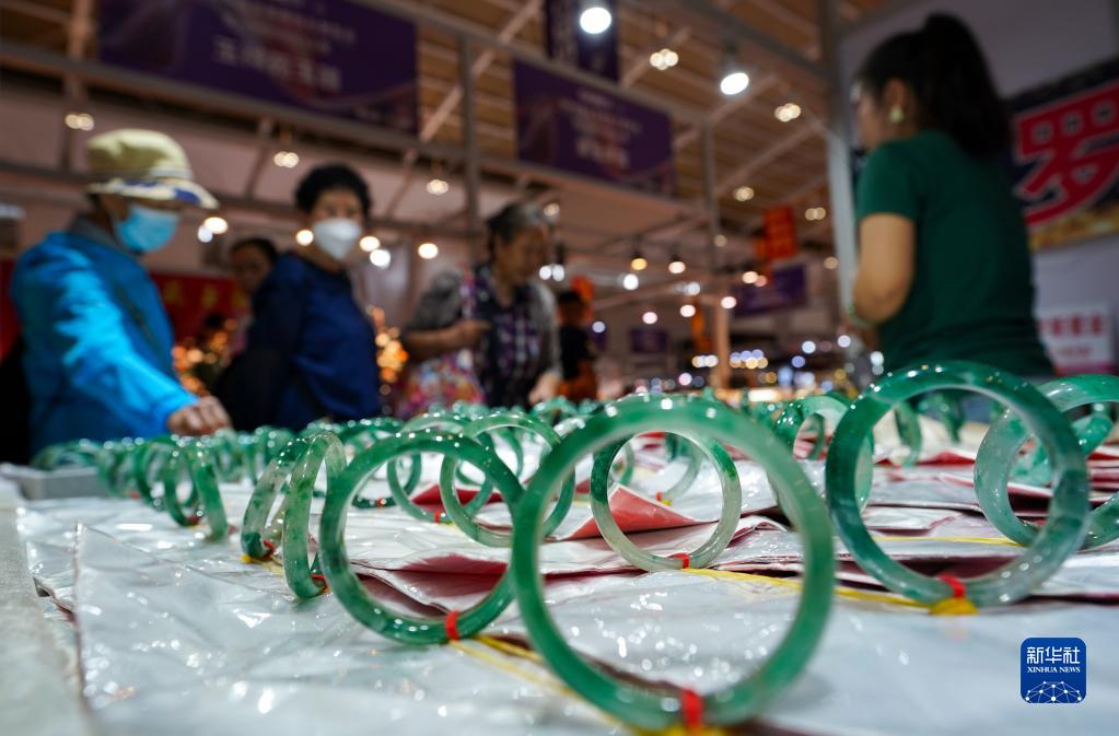 7月6日,參觀者在石博會上選購翡翠手鐲。