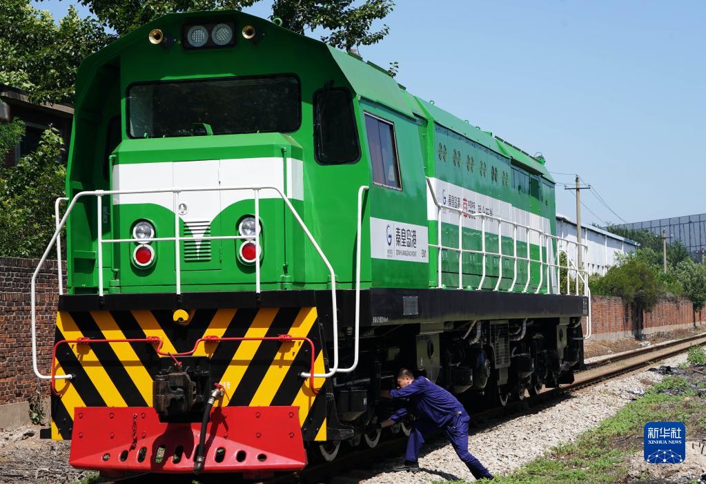 7月6日,在秦皇島港港區內,工人在做秦皇島港新能源1號機車運行前的準備工作。
