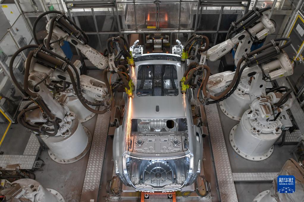 在位于吉林長春的一汽紅旗繁榮工廠焊裝車間內,機器人焊裝車輛零部件(7月6日攝)。