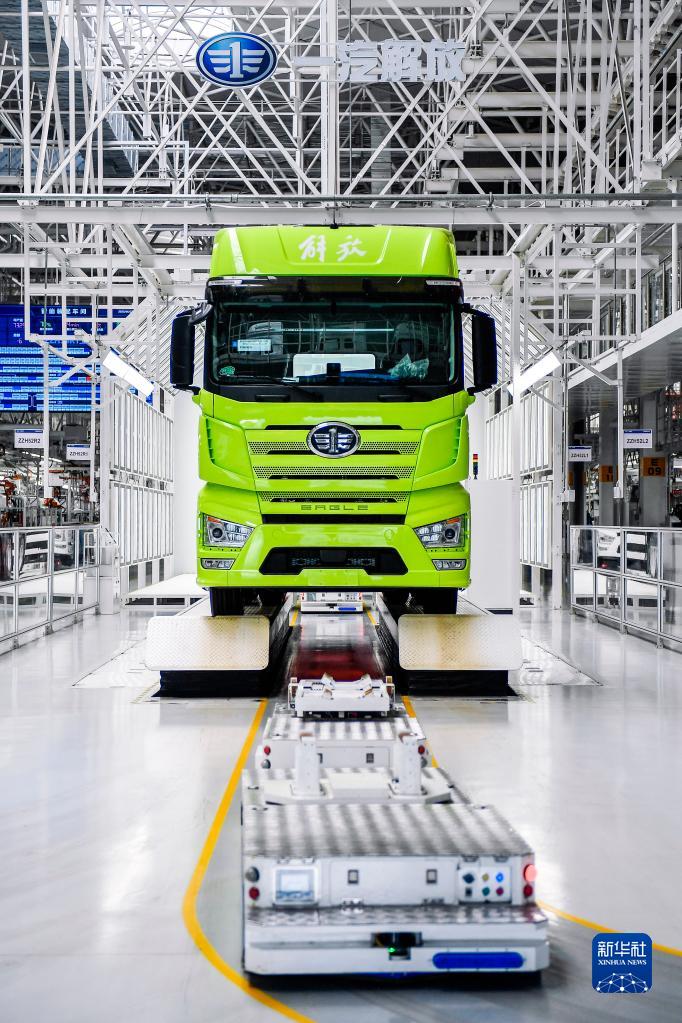 在位于吉林長春的一汽解放J7智能工廠內,AGV搬運機器人將完成裝配的車輛運下生產線(6月27日攝)。