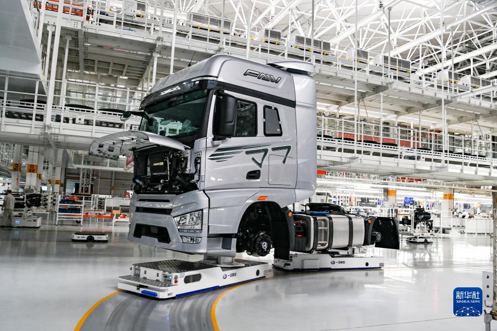 在位于吉林長春的一汽解放汽車有限公司J7智能工廠內,AGV運載著車輛行駛在車間內(6月12日攝)。