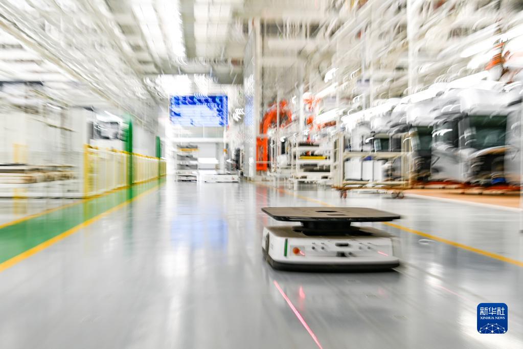 在位于吉林長春的一汽解放汽車有限公司,一臺AGV行駛在J7智能工廠車間內(6月12日攝)。