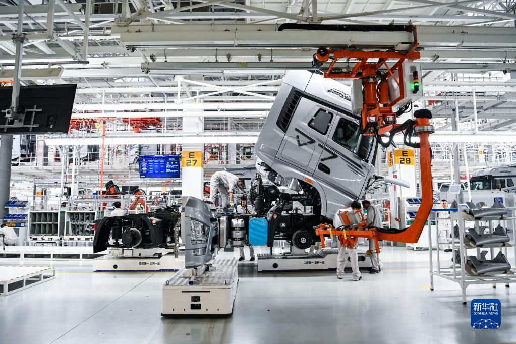 在位于吉林長春的一汽解放汽車有限公司J7智能工廠內,工人在AGV上裝配車輛(6月12日攝)。
