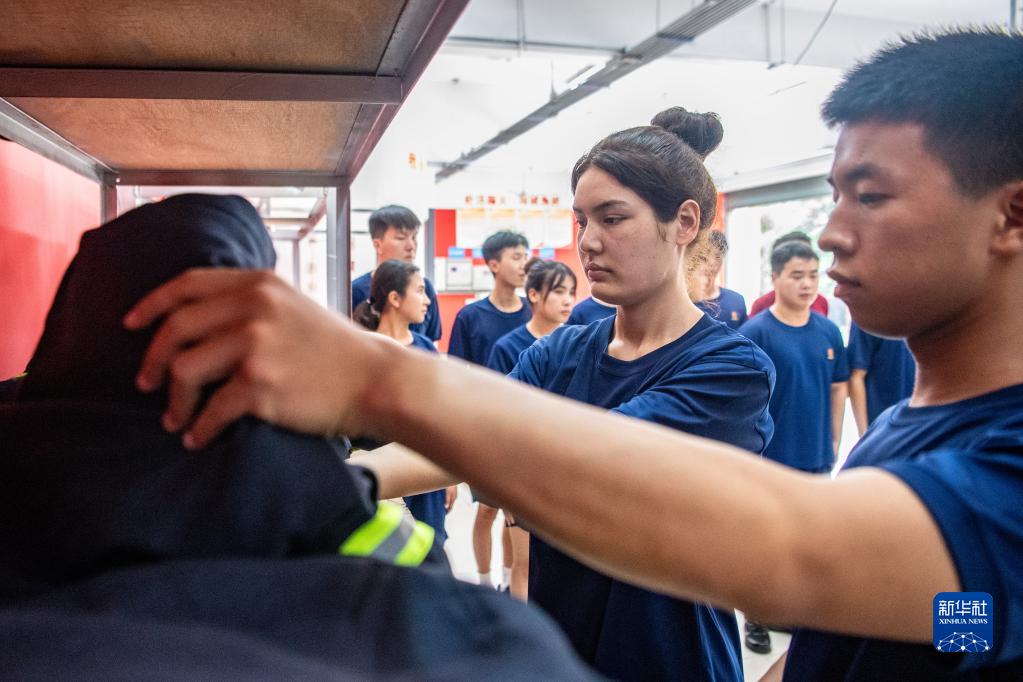 6月28日,熱依來·吉力力(前左)與同學們在上建筑消防設備實訓課。