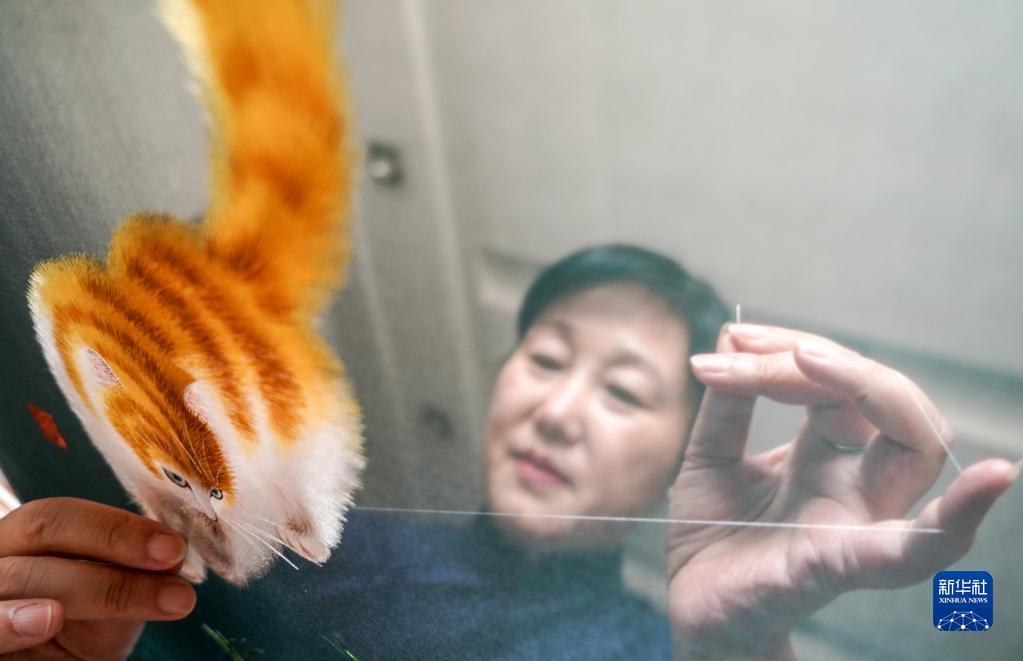 蘇繡國家級非遺傳承人姚惠芬在刺繡雙面繡(2019年6月11日攝)。
