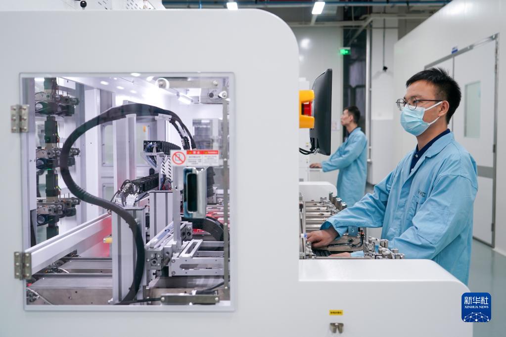 在位于蘇州工業園區的蘇州華興源創科技股份有限公司,工作人員在研發車間內操作先進封裝芯片測試機(7月5日攝)。