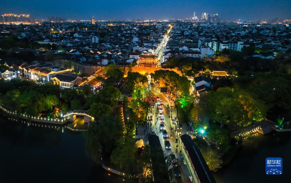 蘇州閶門夜景(4月10日攝,無人機照片)。