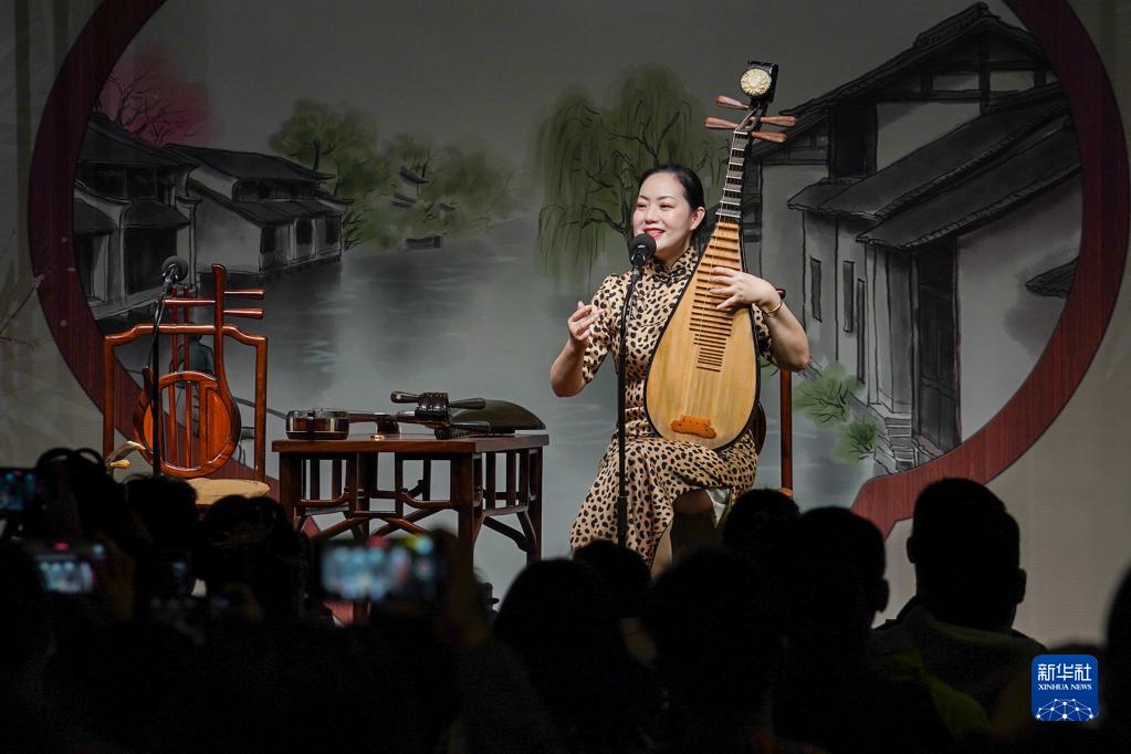 評彈演員吳亮瑩在蘇州市姑蘇區一處評彈茶館演唱(4月5日攝)。