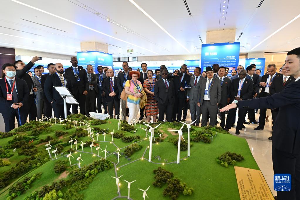 7月6日,駐華使節在國機集團國際化經營成果展廳內參觀由該集團承建的肯尼亞基佩托風電項目沙盤。