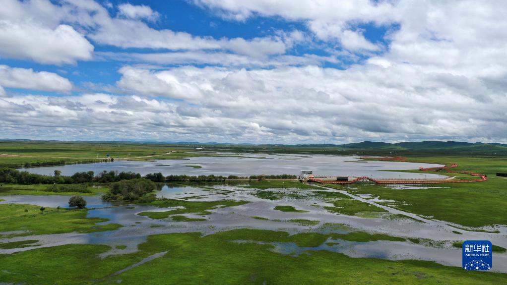 這是瑪曲縣河曲馬場的濕地草原景色(7月5日攝,無人機照片)。