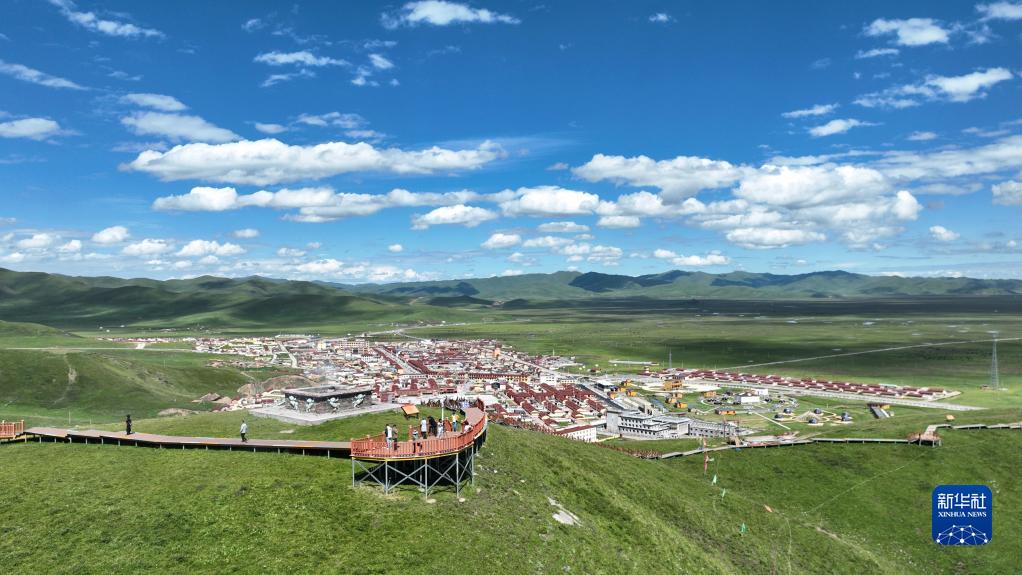游客在甘南藏族自治州瑪曲縣阿萬倉濕地的觀景平臺上游覽(7月6日攝,無人機照片)。