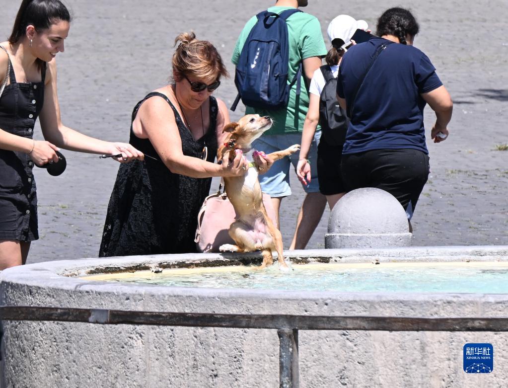 7月7日,一名女子在意大利羅馬人民廣場的一處噴泉幫自己的寵物狗沖涼。