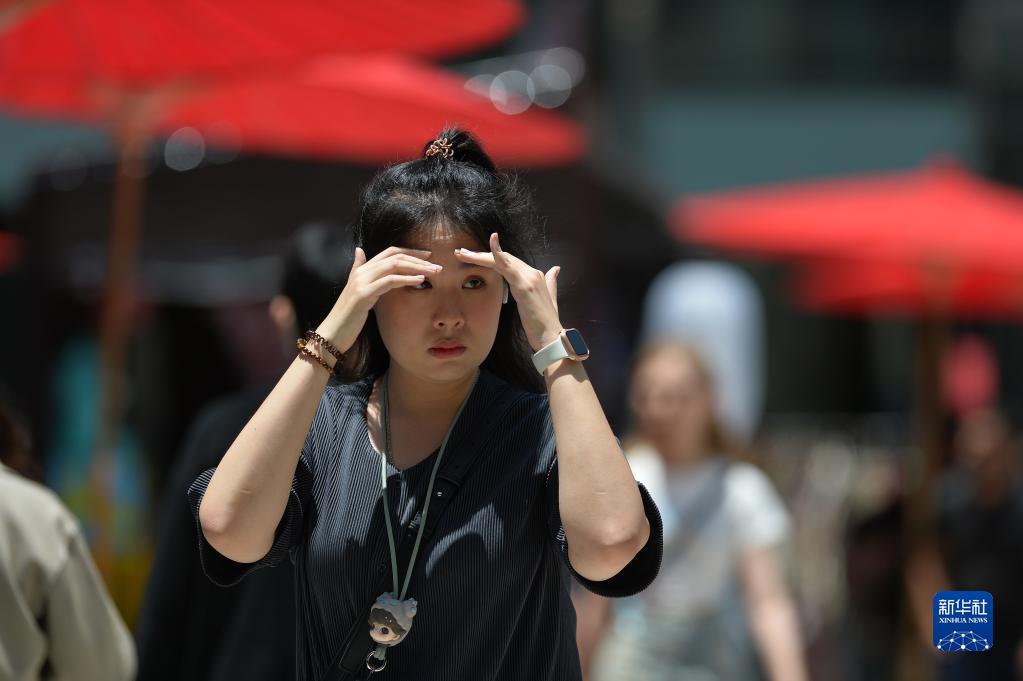 7月7日,行人在泰國曼谷街頭用手遮陽。