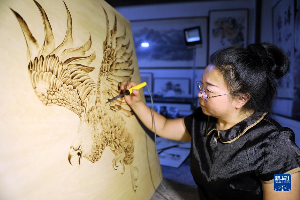 手持電烙筆,在椴木板上利用高溫繪出美麗的畫作,這種作畫形式就是有“火針刺繡”之稱的烙畫。李影是遼寧省營口市李氏烙畫藝術代表性傳承人,她自幼受家庭熏陶學習烙畫技藝,在傳承傳統技藝的基礎上,不斷創新作畫技巧、豐富烙畫表現形式。李影認為,烙畫技藝和其他優秀的傳統手工藝一樣,需要守護傳承,要讓更多的人來接觸、了解烙畫。