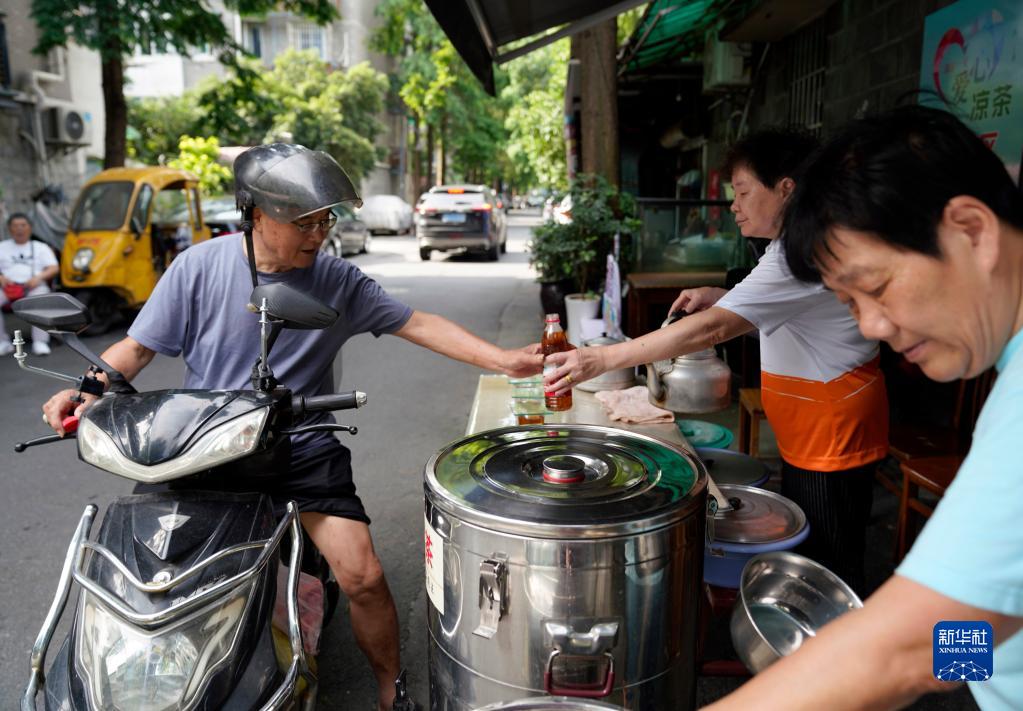7月7日,杭州市濮家聯合社區愛心涼茶攤的志愿者為路過的社區居民送上涼茶。