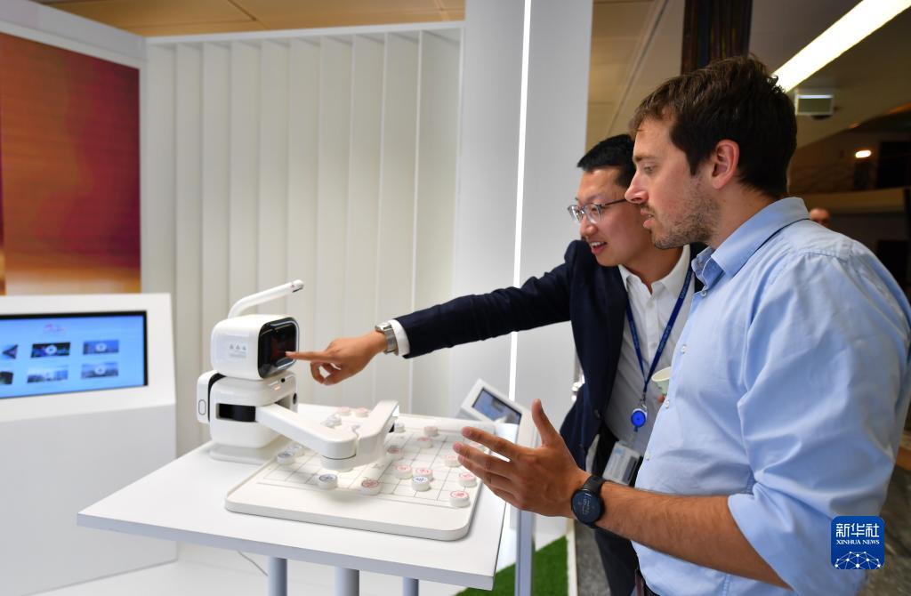 7月6日,在瑞士日內瓦,與會者在中國與世界知識產權組織合作五十周年系列活動——世界知識產權組織主場活動上與AI下棋機器人下中國象棋。
