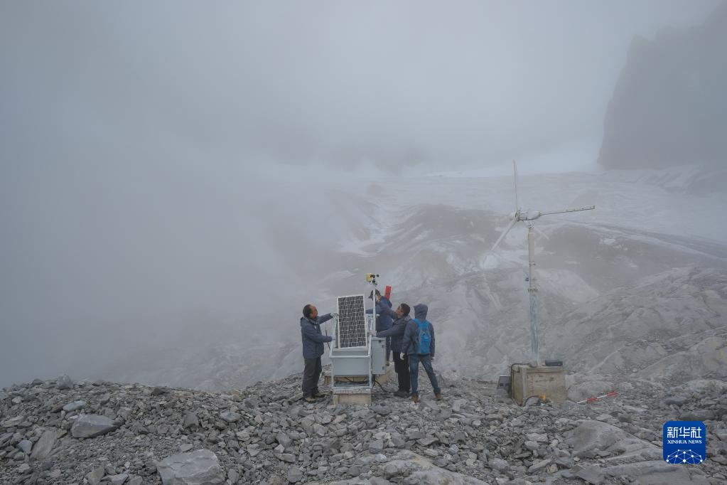 玉龍雪山站站長王世金(左一)和團隊成員在玉龍雪山上一處氣象觀測站點查看設備(6月19日攝)。