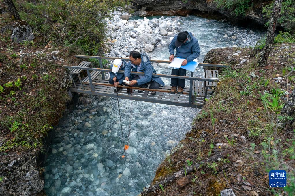 玉龍雪山站站長王世金(中)和團隊成員在白水河水文觀測點測量冰川融水流速(6月16日攝)。