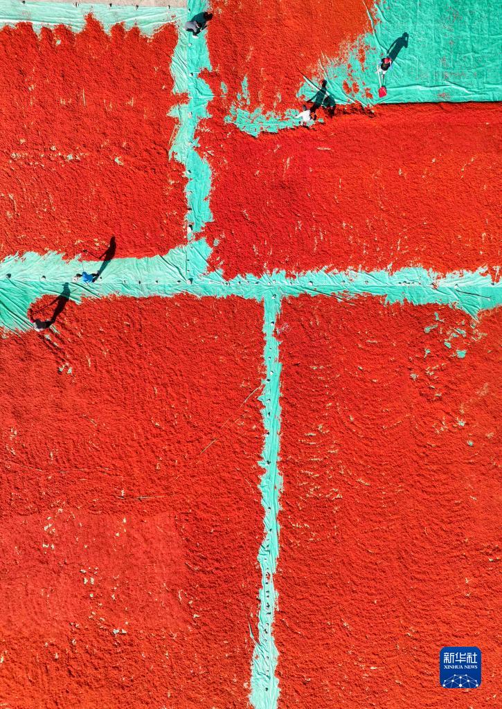 7月7日,新疆裕民縣江格斯鄉的村民在晾曬紅花絲(無人機照片)。