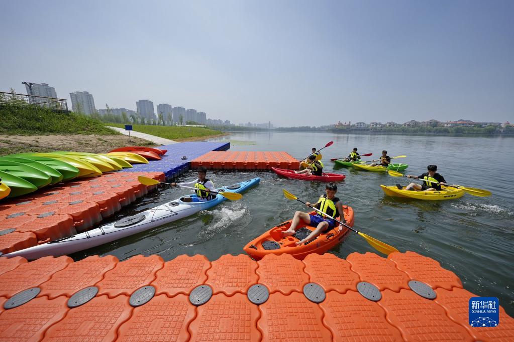 7月7日,學生在河北省遷安市灤河左岸體育公園練習皮劃艇。
