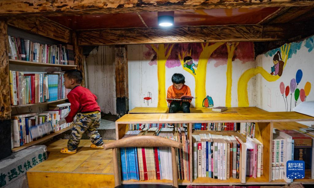 7月5日,秋那桶村的小朋友們在“半山花語”書屋選書、讀書。新華社記者 江文耀 攝