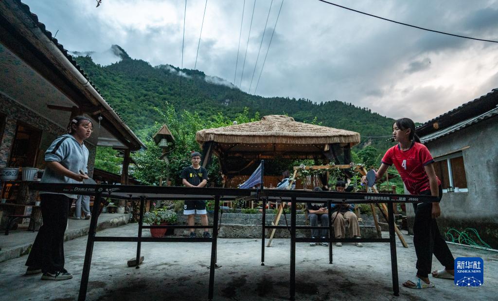 7月5日,秋那桶村的小朋友們在“半山花語”書屋的小院里打乒乓球。新華社記者 江文耀 攝
