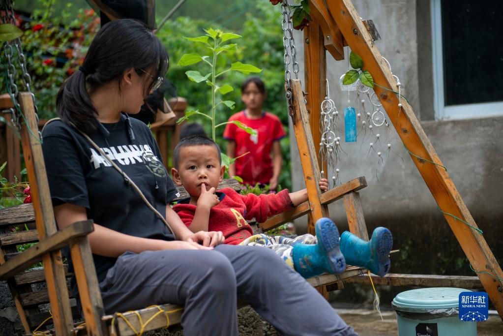7月5日,志愿者李苗恩(左)陪秋那桶村的小朋友在“半山花語”書屋的院子里玩耍。新華社記者 徐嘉懿 攝