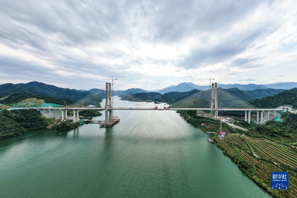 這是7月7日在湖南省益陽市安化縣拍攝的官新高速雪峰湖大橋施工現場(無人機照片)。