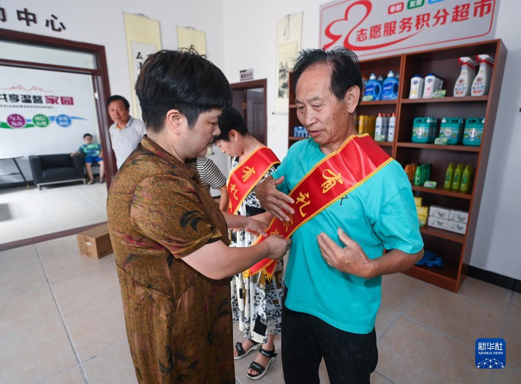 7月7日,在杭州市臨安區清涼峰鎮頰口村文化禮堂的“家風銀行”積分超市,村干部在給上季度德善積分排名前五的村民頒獎。