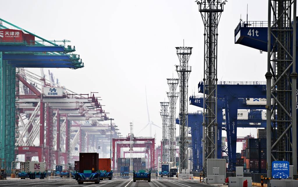 7月7日,智能水平運輸機器人在天津港“智慧零碳”碼頭作業。