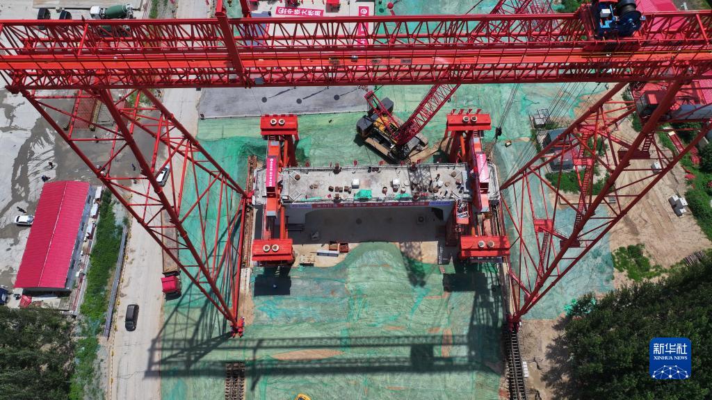 7月7日,在濟濱高鐵濟陽黃河公鐵兩用特大橋建設現場,中鐵大橋局的施工人員在架設鋼桁梁(無人機照片)。