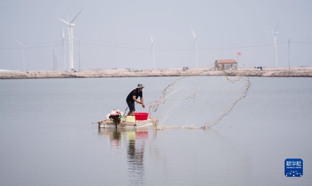 7月7日,在滄州渤海新區黃驊市一家養殖專業合作社蝦塘,工人在打撈對蝦。