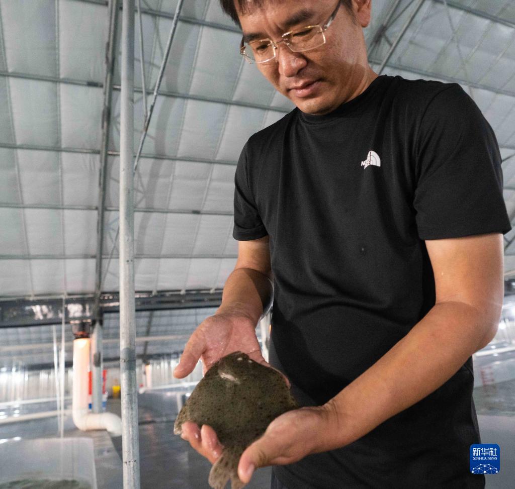 7月7日,在滄州渤海新區黃驊市一家水產養殖有限公司養殖車間,工人在查看多寶魚生長情況。