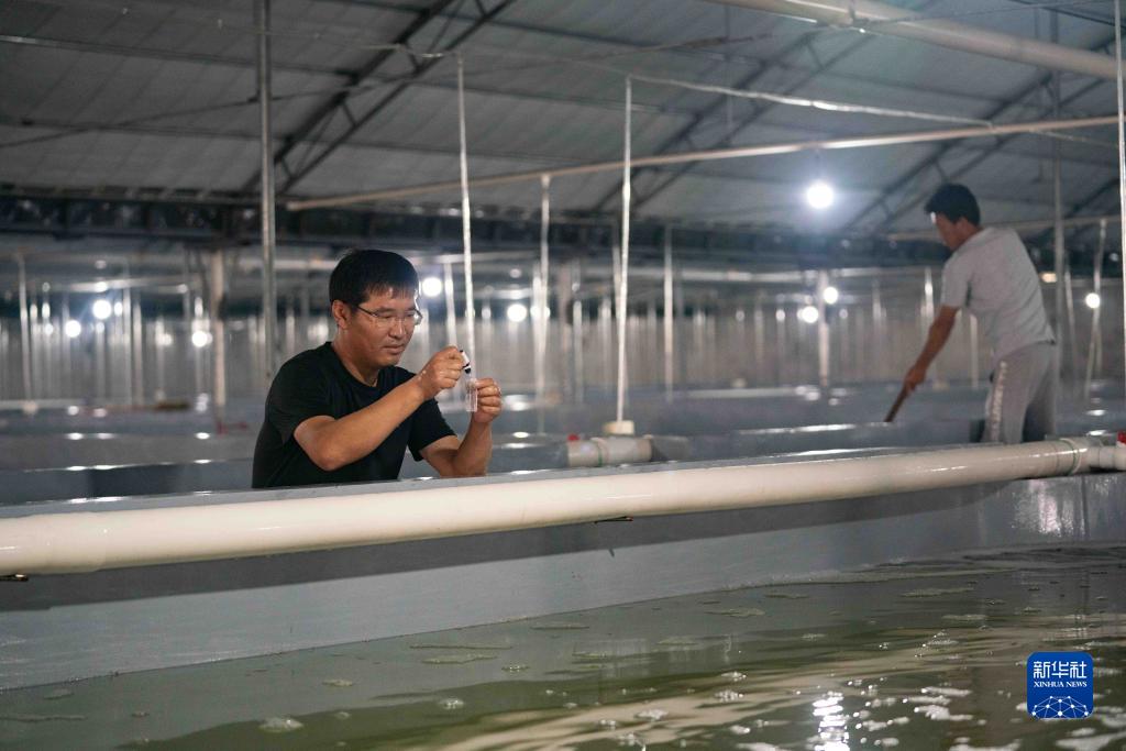 7月7日,在滄州渤海新區黃驊市一家水產養殖有限公司養殖車間,工人在檢驗養殖池水質。